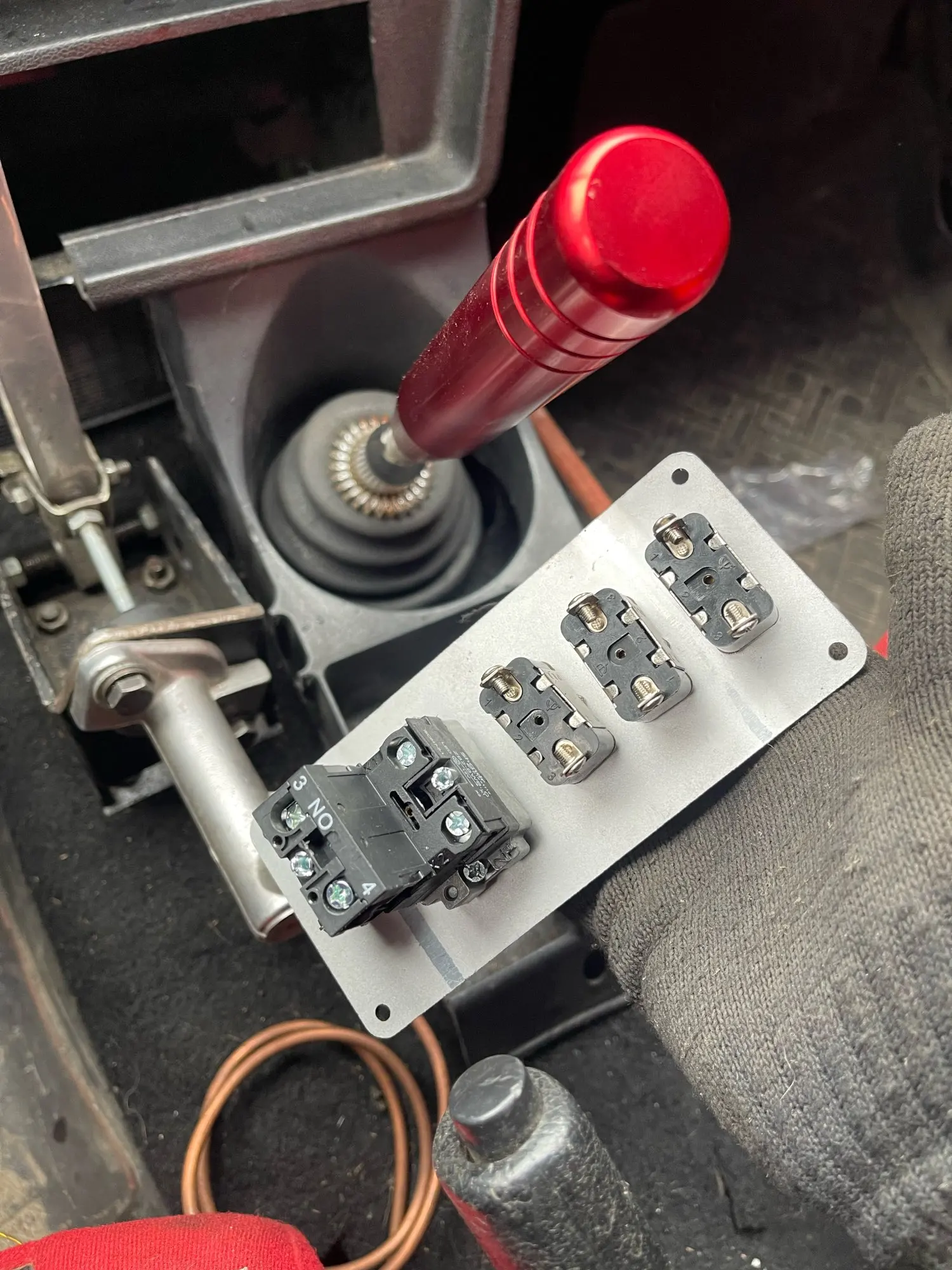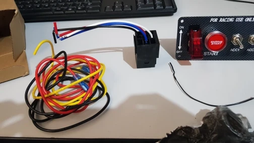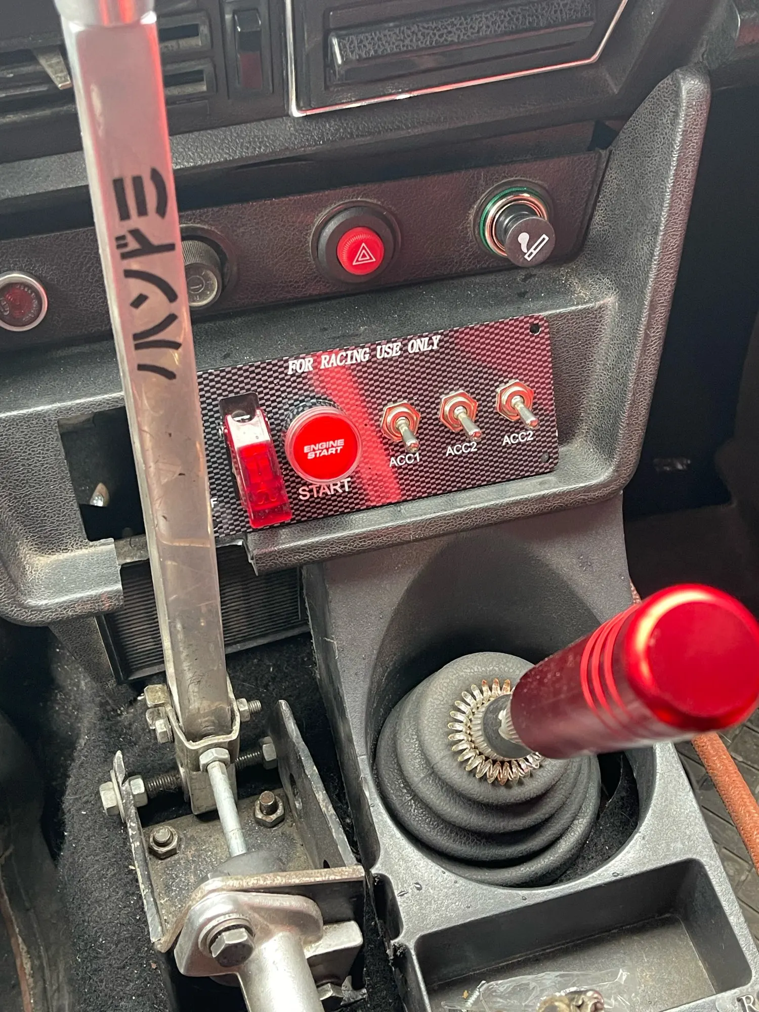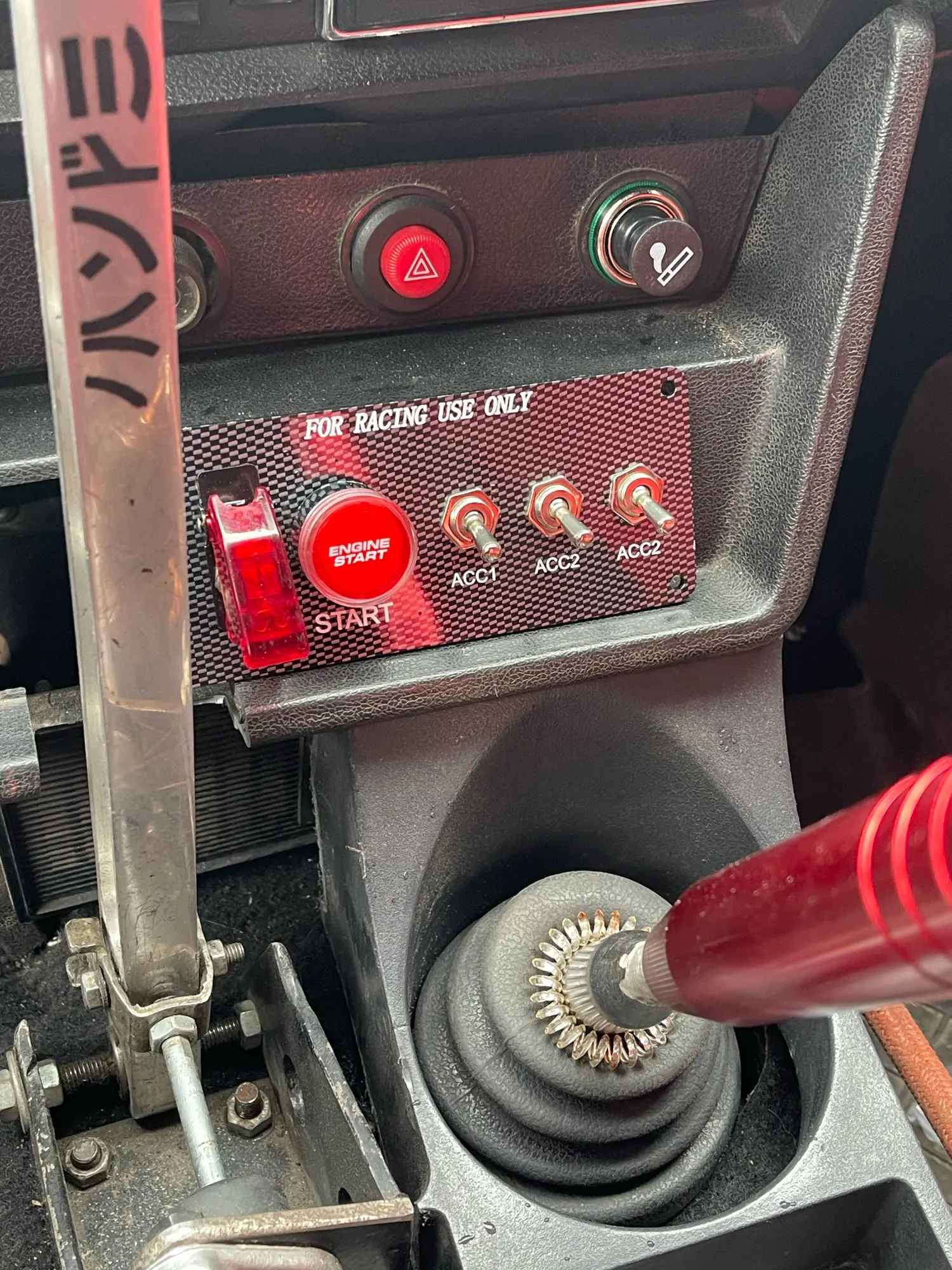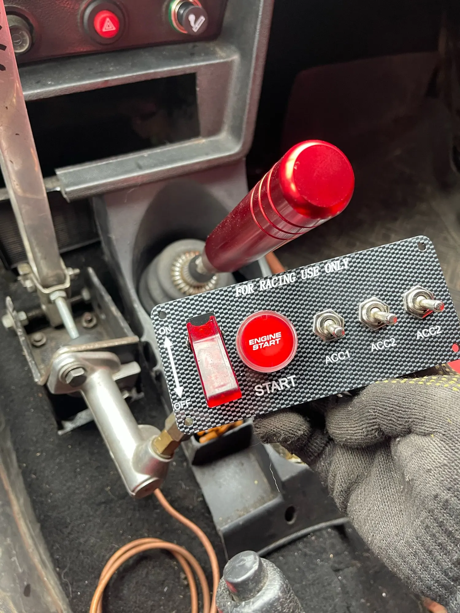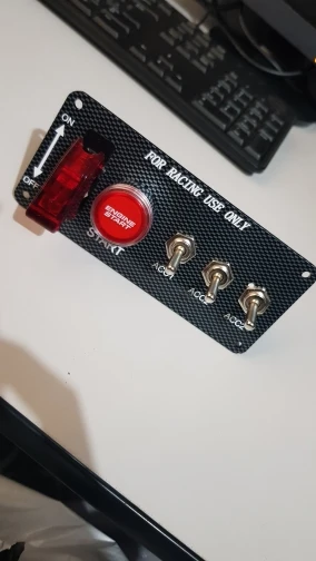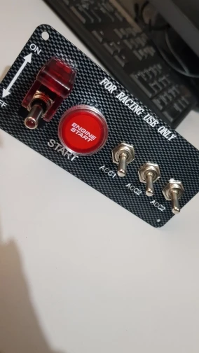 - 1 x race car switch panel (includes 1 x covered lighted toggle switch, 1 x red engine start button, 3 x 2 pin toggle switches)